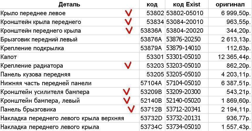 А в табличке уже 14 пунктов. Это только то, что касается крыла и передней панели (телевизора). А ещё капот и бампер со всеми потрохами будет, фары.