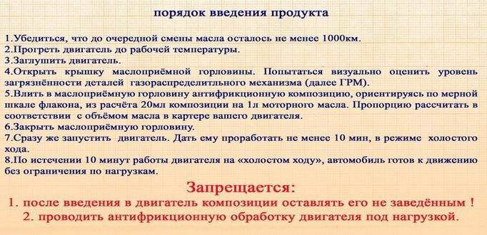 Евген писал(а): Запрещается после введения в масло антифрикционной композиции оставлять не заведенным двигатель и проводить обработку двигателя под нагрузкой. Ну и чего тут непонятного? 1. Хорошо прогреть двигатель. 2. Заглушить и залить АР Цитата: Запрещается после введения в масло антифрикционной композиции оставлять не заведенным двигатель 3. Сразу завести мотор и дать ему поработать на ХХ 10 минут, Цитата: Запрещается проводить обработку двигателя под нагрузкой 4. После окончания обработки (10 мин.) можно эксплуатировать двигатель в обычном режиме.