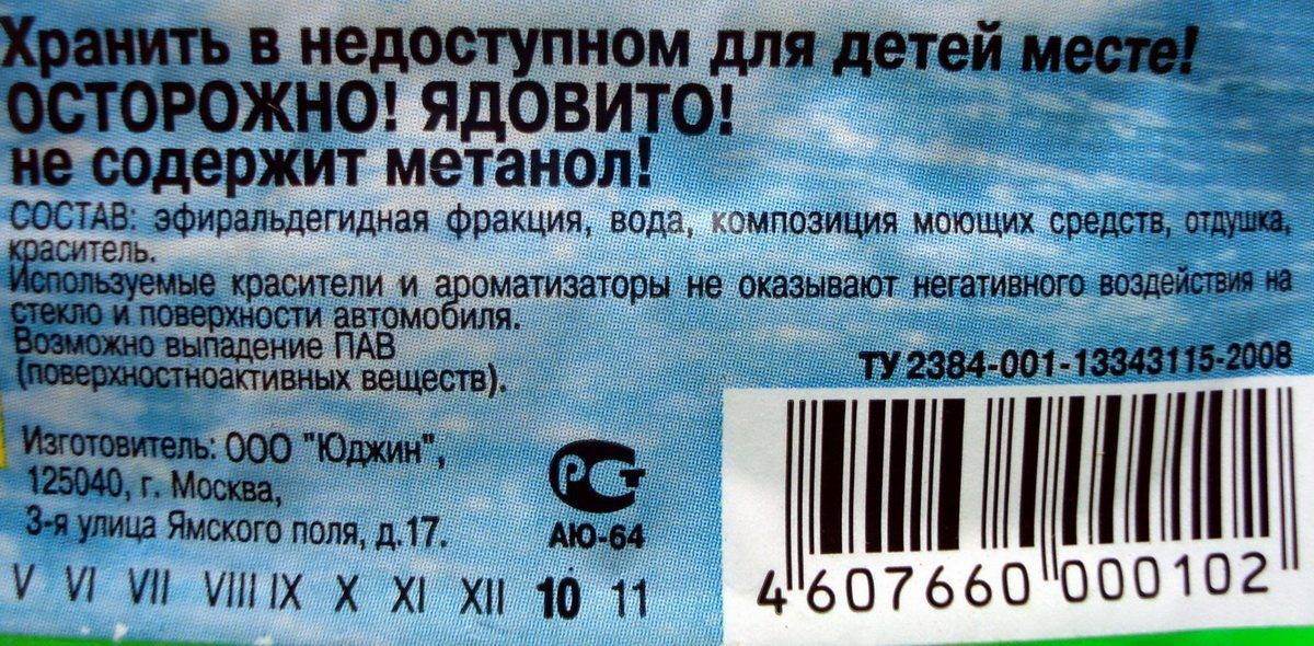 Состав: этиленгликоль, ПАВ, отдушка (0,03%), краситель (0,0007%), бензоат денатония (не менее 0,0015%).