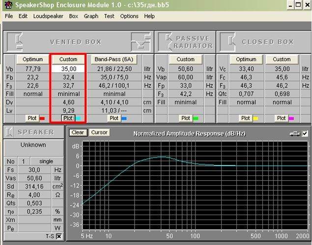 Лодочникголовка 35 ГДН, 4 Ома, по формуле расчета выбора подходящего короба выяснилось, что корпус ФИ - самый удачный. Я изначально считал короб под эквивалентный объем головки - 50 литров, но потом ушел от этой идеи, т.к. резонансная частота головки 30 Гц была на пике АЧХ (дин долго не проживет). Добился подбором объема, чтобы данная частота не воспроизводилась. Повторюсь, что опора идет на расчетный график АЧХ. С уменьшением литража короба частота воспроизводимых частот смещается в положительную сторону - начальная частота воспроизводимая дином двигается в плюс. Лодочник писал(а): набивать синтепоном я проще обложу внутренние стенки ватином или синтепоном.