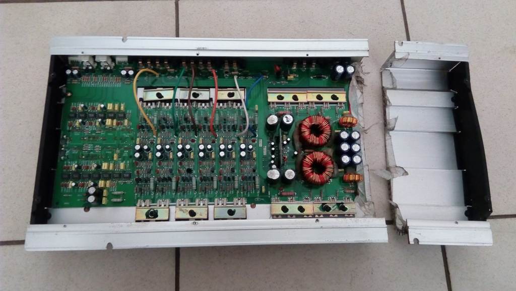 Это была часть радиатора блока питания, видишь 6 проводов, это на выход с уся на клеммы. Он внутри 6-тиканальный, только 5 и 6 каналы подключены сразу в мост для сабвуфера и имеют фильтр НЧ на 60-120Hz