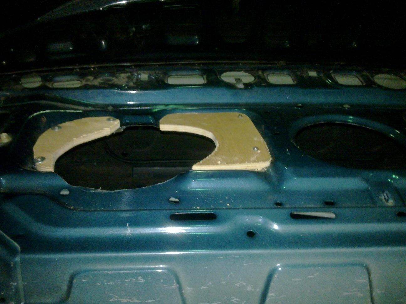 Хочу поделиться своим вариантом установки динамиков просто такого варианта не встречал.Для начала разметил и вырезал лобзиком овалы в пластмассовой полке.Поставил полку на месте и отметил по железной полки вырез.Также лобзиком вырезам овалы в металлическую полку(очень трудно вырезаются).Дальше берем фанеру толщиной 10-12 мм и вырезаем полосу шириной 175 мм .Это как раз ширина впадины в полке куда будем устанавливать динамик. Дальше по месту подгоняем по два куска фанеры с каждой стороны так чтоб фанера легла на самое "дно" впадины полки.Дальше приклепляем каждый кусок фанеры четырмя болтами на 4мм.Устанавливаем полку на месте и размечаем по фанере овалы.Потом ставим динамики и карандашом размечаем места по крепления динамиков.Снимаем динамики и сверлом на 5мм просверливаем насквозь. Три отверстия попадают в фанеру а одно в металле.Сверху обыкновенным дрелем не подобраться.Надо маленьким или угловым шуруповертом.Я делал со стороны багажника на глаз.Поэтому пришлось немного подгонять отверстия.Монтируем на месте динамики и все.Провода как обычно проводим по полу снимая накладки порогов. Чего то фото не могу вставить.