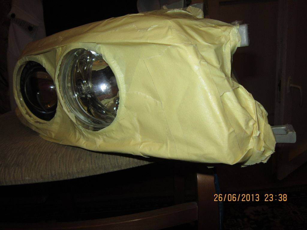 я тоже вставлю свои пять копеек так как свет свои фар меня не устраивал....как бы сказать что он их не устраивал, ну старые фары я выкинул в помойку даже не стал их оставлять на потом=) пока я без поездок, вот кромсаю машину вот первая примерка=)))))) откуда фары - большой секрет=)))    уже испорчен хороший капот, бампер, и два крыла, две фары депо легли смертью храбрых...кромсаем к чертовой матери =) смысл - взять и сделать моноблок из фар =)