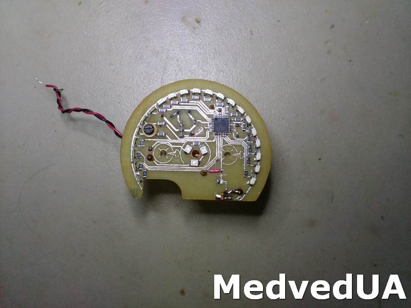 Медведь, спасибо огромное за исходники плат, на их основе сделал себе RGB подсветку. Если кому интересно, выкладываю платы под RGB-подсветку панелей и стрелок. UPD: Прошивку выкладываю с исходником, если есть желание там можно много чего напихать еще (например зависимость цвета стрелок от оборотов или скорости), контроллер используется только наполовину.... Заливать в контроллер нужно hex+eep файлы, иначе глюки при первом запуске обеспечены конкретные. Фьюзы установить на тактирование от внутреннего генератора на 8 мгц. Прошивка немного сыровата, но вычищать глюки (они касаются только режима программирования) уже не было времени, а потом желания снимать приборку заново для перепрошивки.... Общая логика работы: Зажав кнопку "SELECT" на 2,5 сек, заходим в режим установки: "цвет циферблата->яркость циферблата->цвет стрелок->яркость стрелок->" далее по кругу сначала, режим меняется кратким нажатием на "SELECT". "SELECT" на 2,5 сек или 8 сек. бездействия, выход из режима установок с запоминанием настроек. В режиме подсветки кнопками "UP", "DOWN" - меняется общая яркость панели с сохранением разницы в яркости между стрелками и циферблатом(то есть если одна яркость на максимуме а вторая на минимуме - то ничего менятся не будет). "SELECT" на 2,5 сек или 8 сек. бездействия - запоминание яркости. у панели 2 независимых режима работы: 1-подсветка по зажиганию и 2-при включенных габаритах. Ограничения наложены на режим габаритов: мин яркость панели(стрелок) 3% (1/32), максимальная 75% (24/32).То есть полностью выключить в режиме габаритов нельзя. В режиме зажигания ограничений нет. Цвета и яркость для обоих режимов устанавливаются независимо. Для нормальной работы стрелок, необходимо заменить оранжевую краску (тупо ободрать) на них, на белую (я делал белым лаком для ногтей). Плату с кнопками вытащил на проводке и закрепил снизу панели над ногами, на двусторонний скотч. И невидно, и управлять легко, и во время движения (если не дурак) туда не полезешь.
