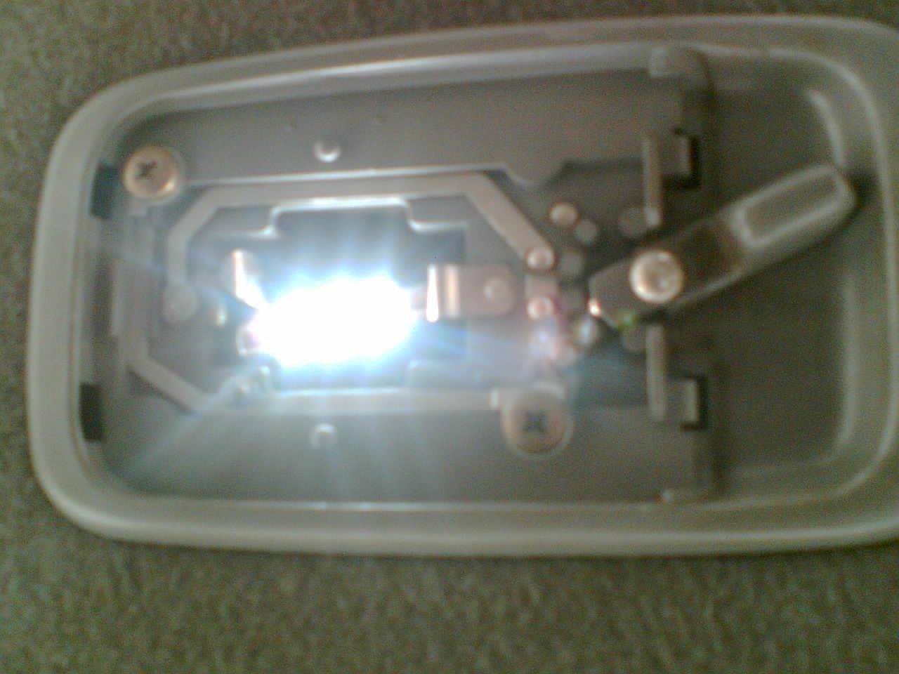 Я тож решил замутить подобную подсветку. Т.к. с паяльником не дружу, решил пытаться что-то сделать, заменив штатные лампочки на диоды. За качество фоток не судите строго: тока телефон был под рукой. Сначала был плафон. По длине ниче подходящего не нашел, пришлось засунуть как на фотке. Скажу сразу: ниче не падает, более того держится так, что доставать надо, используя отвертку.
