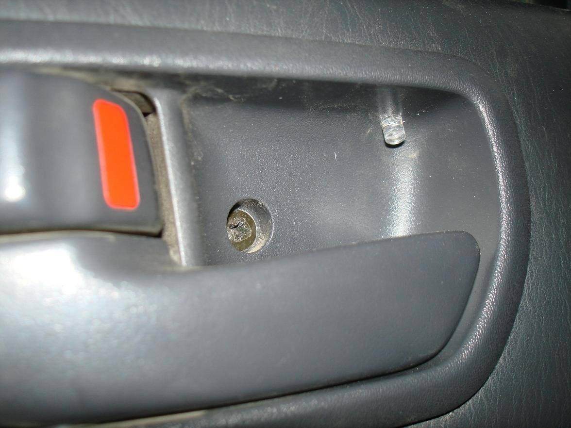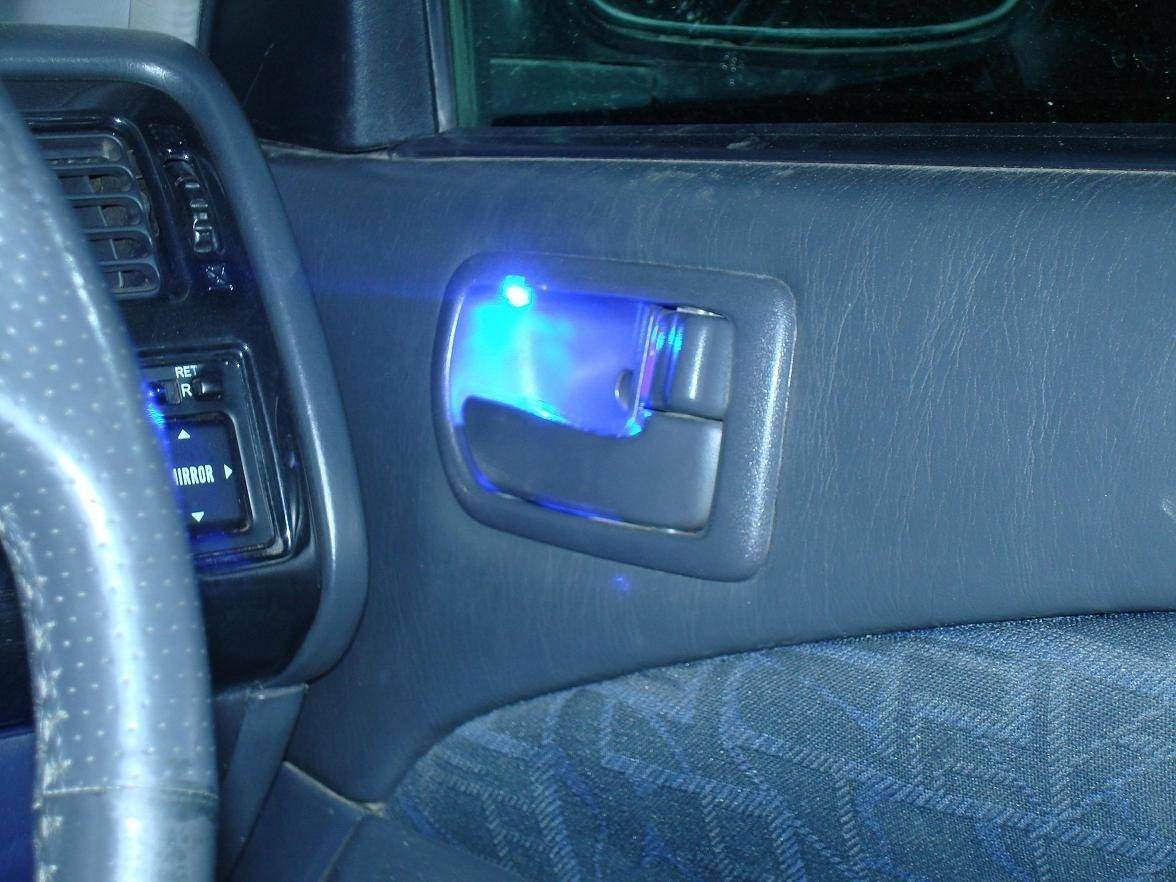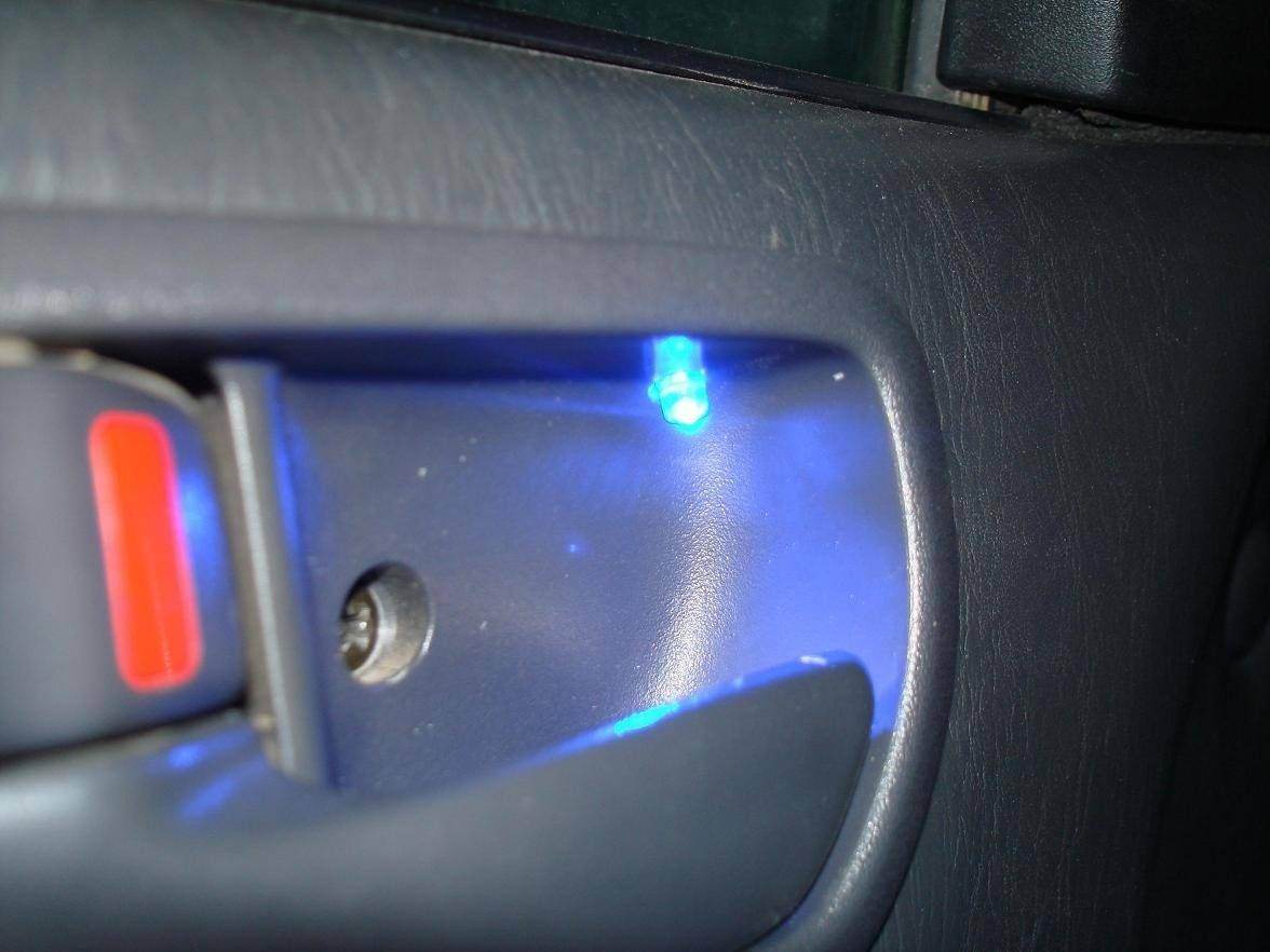 2) Подсветка дверных ручек, состоит из диода, вставленного в отверстие ручки после работы над ним дрелью J, источником тоже является свет на потолке.
