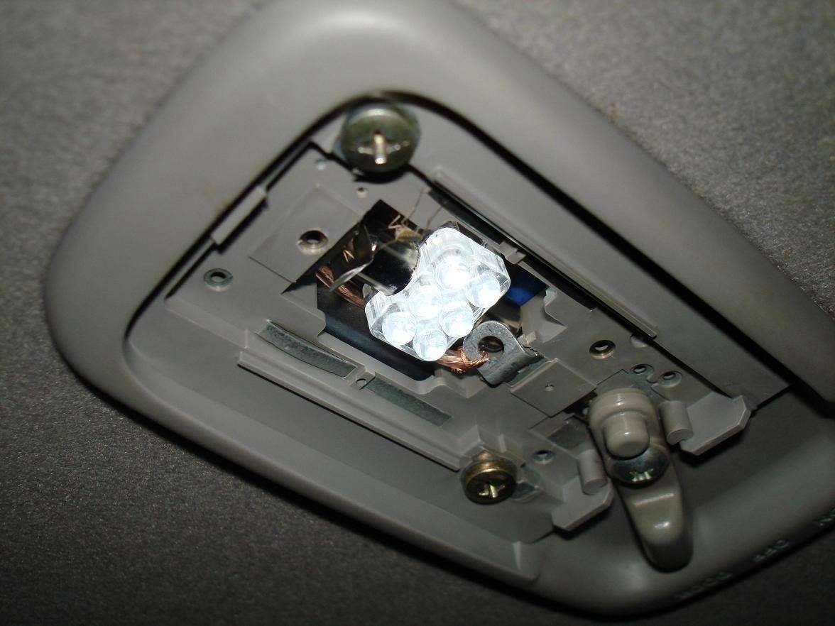 3) Сам свет на потолке, купленная диодная лампа состоящая из шести диодов по размеру превышающая родную лампу для ее установки выкрутил «плафон» и подрезал (согнул) усики держится крепок для смены ее ,только выкручивать «плафон» .