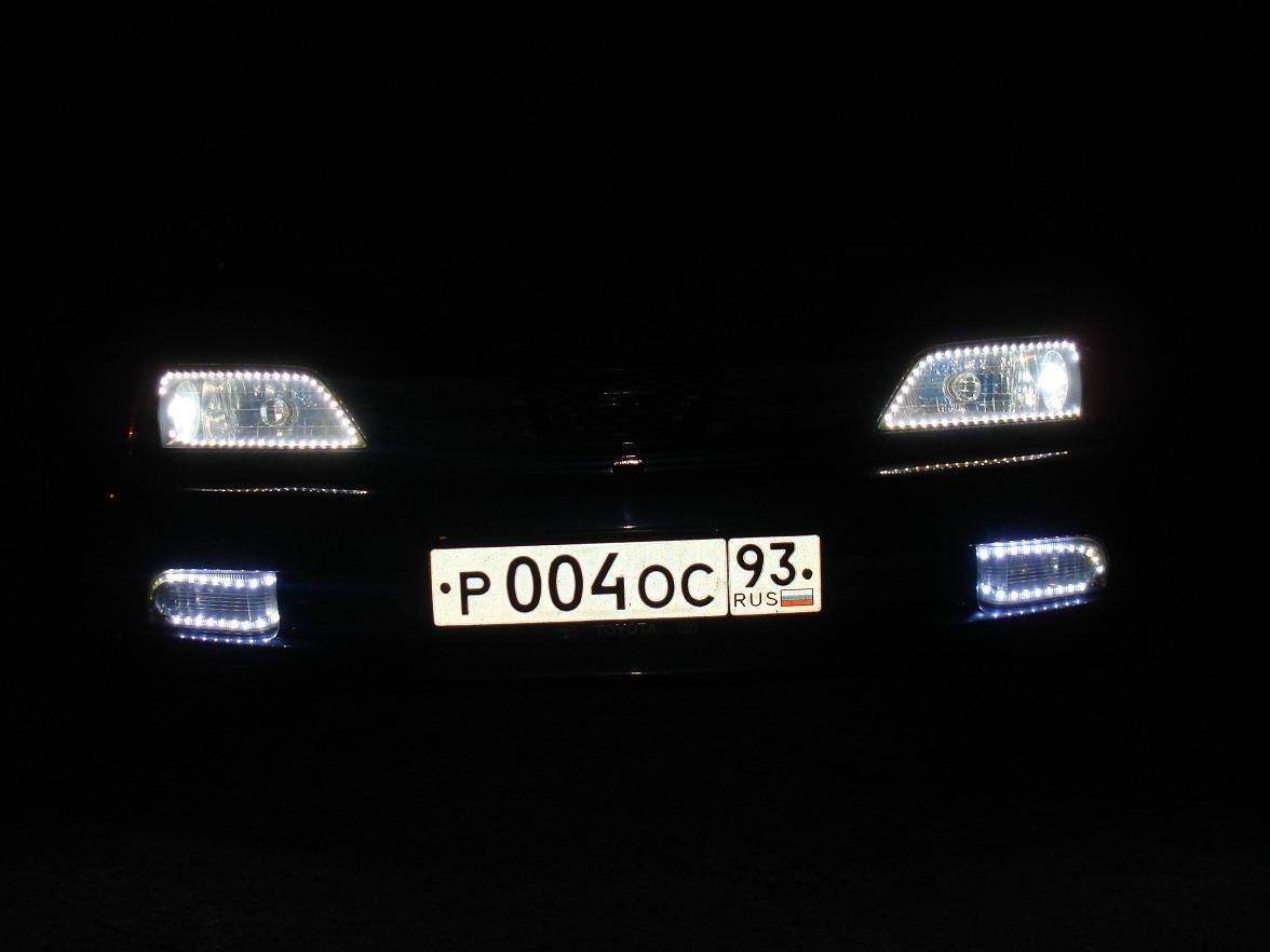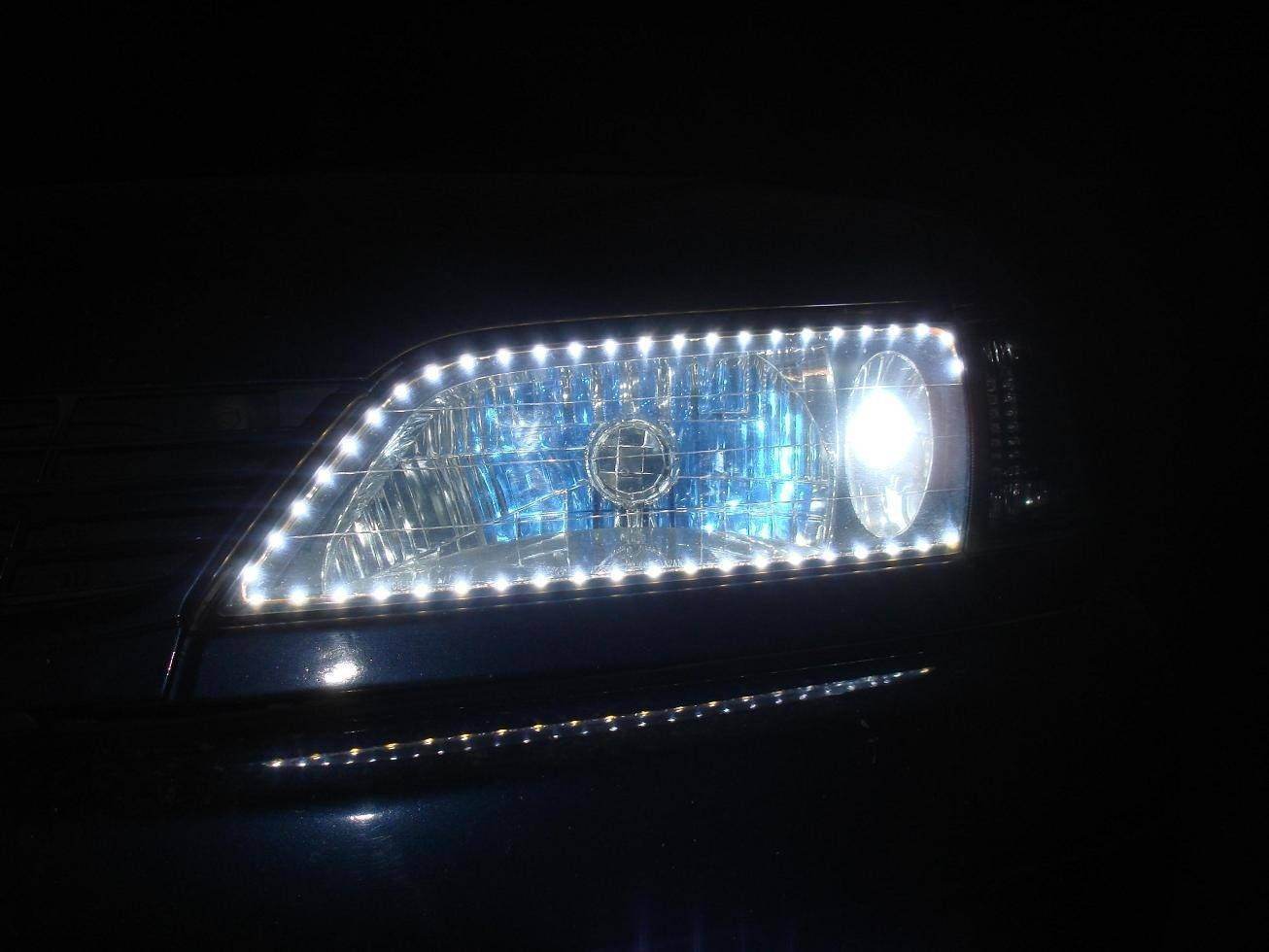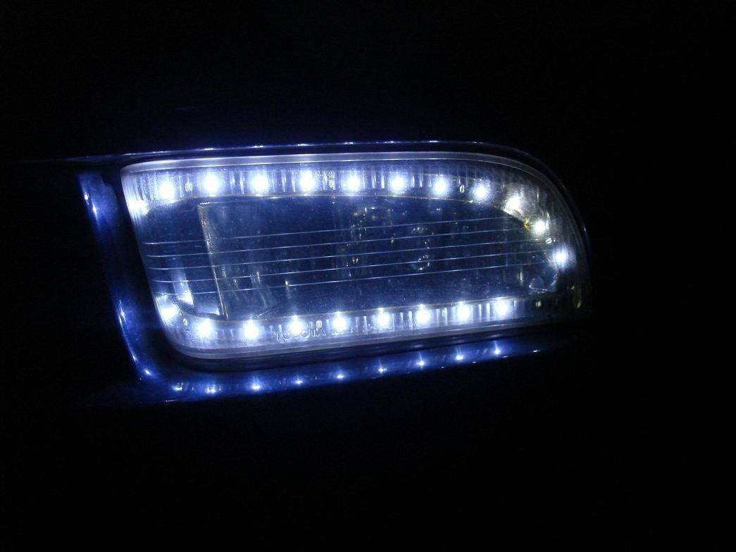 Противотуманки их я разбирал (обратно на герметик садил) так как это было первое знакомство с диодной лентой я купил влагозащитные (они на клейкой основе) с синим оттенком, заставить принять их нужную форму было трудно (жесткая основа) пришлось на изгибах подрезать питание от габаритов.