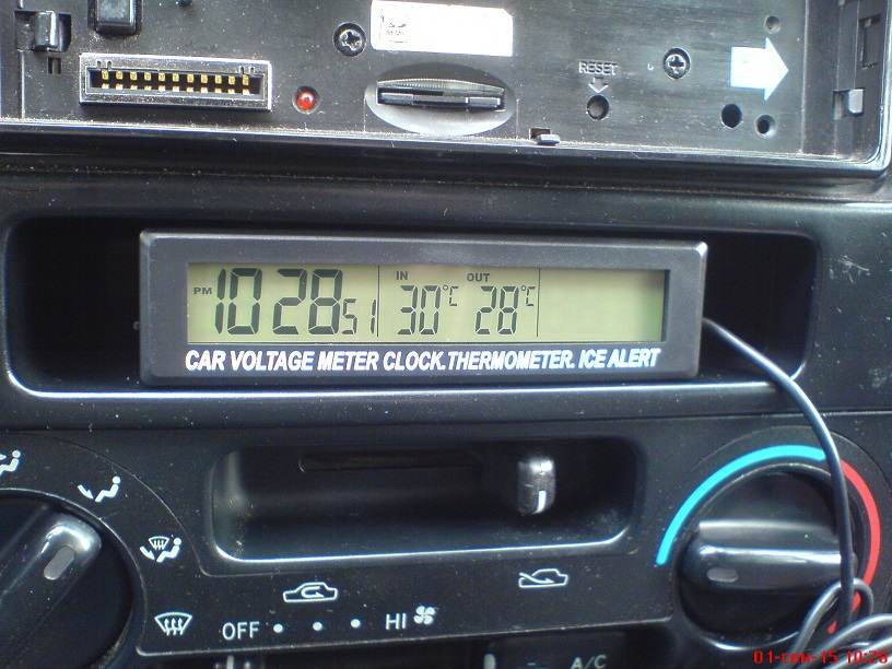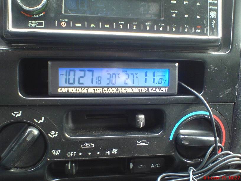 Поставил такой девайс. Пока временно -для тестирования . Покупал такой специально под размер бестолковой полочки .Вошел точно и туго Показывает время , температуру внутри и за бортом , а так же напряжение в борт сети . Подсветка работает постоянно и может быть оранжевая или синяя . По температуре привирает не сильно , это касается внутреннего датчика -мне это не критично . Уличный показывает точно . Вольтметр вообще точный - тут наверное просто повезло .Работает от батареек ( часы и термометр) . Позже изменю свечение экрана на обратный ( думаю лучше будет смотреться оранжевые (синие) цифры на черном фоне .Покупал в соседней республике .. если сообществу нужно могу дать ссылку. Забыл добавить . При понижении до -4 оповестит значком снежинка . При падении напряжения до 9 В должен запищать .Сразу дам ссылку рабочую http://ali.pub/ulcmj