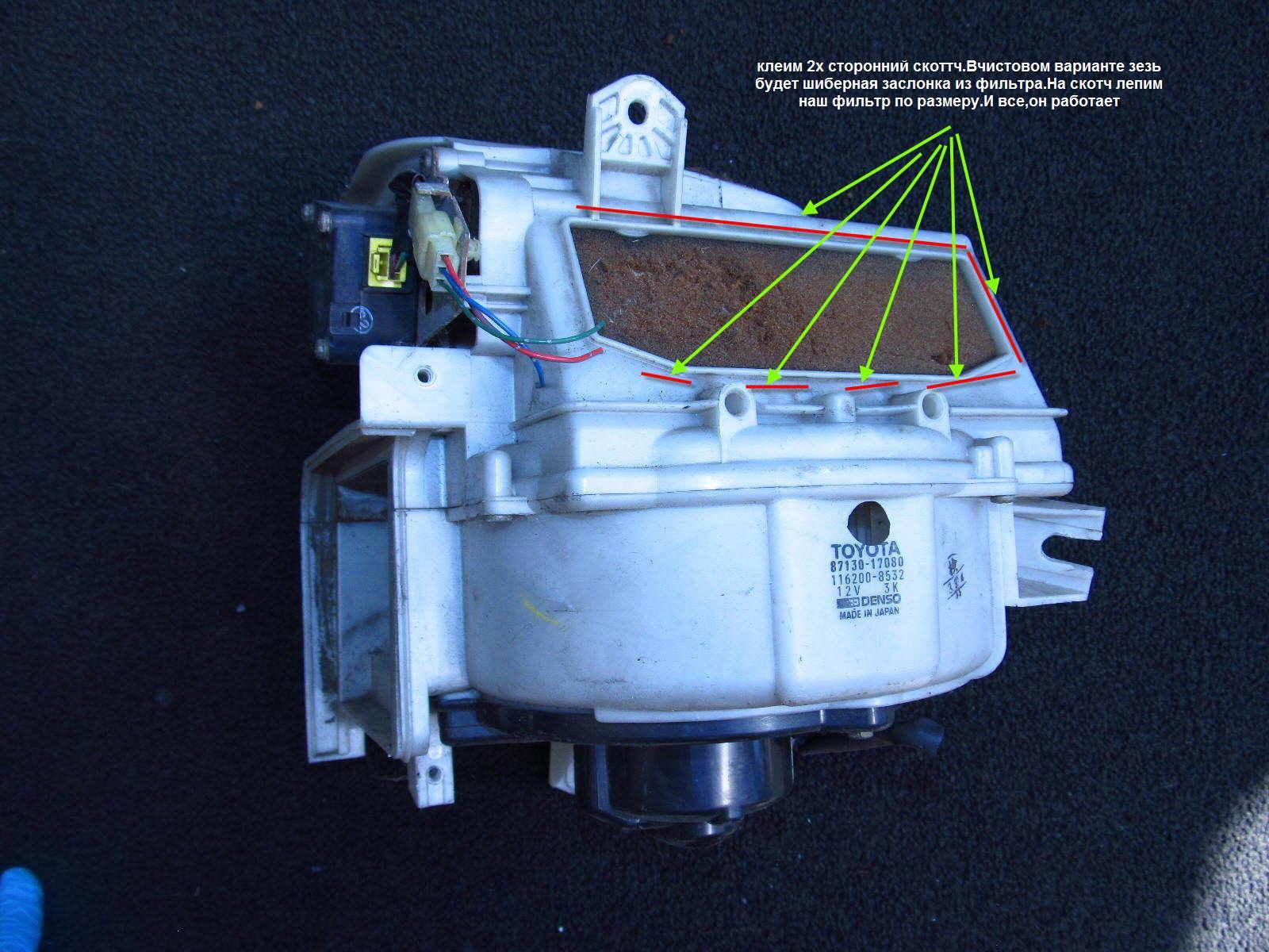 Fritz писал(а): bastynda запости что ты сделал с фильтрацией салона. (из темы про тормоза) --ок,буду выкладывать частями,так как отчет не делал,буду брать фотки из инета и подгонять под тему.Скажу сразу-все оказалось намного проще,чем я себе представлял .ДОРАБОТКА,не переделка !!Пилить,ломать ничего не надо.Машинка БЕЗ кондея . 1 Первое :Фильтр (назовем его Основной)у Карины (знаю еще пару-тройку машин с таким 2-х ступенчатым геморром ) из 2х частей с дырами и возможностью подсоса пыли. 2.Второе:Если нельзя убрать просачивание через Основной-надо сделать его Вспомогательным ------------------------------------------------------------------------------------------------------------------------------- Первым делом я поменял мотор печки .Бош хорош,пока в меру новый.Еще один плюс-не надо разбирать для смазки. -Поставил мотор ДЕНЗО жапан.Мотор в СБОРЕ с крыльчаткой ставится БЕЗ подгонок и переделок ,смазывать его НЕ надо.Из переделок-поменять бошевскую фишку на дензовскую(разные).Дензо тише и мощнеее. ---№ AY194000-9000 --установлен и работает !!  ---Второе:нужно устранить саму возможность попадания пыли ДО мотора,т.е фильтровать забор воздуха .Подбираем фильтр :Угольный, активированный,МОЮЩИЙСЯ ,многоразовый по 6 $ за килограмм  (шутка) Frost King Air Conditioner A/C Filter F1524H производства КНР (по той же цене есть США,качество и цена ОДИНАКОВЫЕ ) http://www.ebay.com/itm/Frost-King-Air- ... 4ab7e53724--есть фильтры покруче и подороже с энзимами и антибактериальные ,но это уже на любителя.(могу сказать заранее- очень хорош,проехался сзади за МАЗом в горку-никакого запаха гари.Если поставить забор воздуха "из салона"-убирает запахи,в том числе и сигарет) --продолжу в след. раз,спать пойду,4 утра уже =========================================================== Ставим фильтр на забор воздуха из салона : (на картинке) .Подсмотрел у америкосов-у них такие фильтры стоят с завода. снимаем перчаточник(2 винта),видим решетку воздухозаборника .Закрываем её фильтром-вырезанный квадрат в один слой фильтра Frost King Air Conditioner или аналогичного.Приклеивать без фанатизма-он будет держаться за счет прижима всасываемым воздухом -в чистовом варианте вместо скотча будет шибер-фильтр тупо будет вставляться на это место ,как заслонка ========================================================== Усовершенствование салонного фильтра и Забор воздуха с улицы выложу чуть позже-для хорошей картинки нужно решетку дворников снять,а времени пока нету