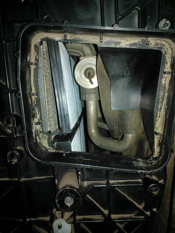 да ничего там обламывать не надо. там же получается идет две трубки, и они попадают как раз между ушей верхнего фильтра. если у тебя конечно испаритель не стоит криво (что маловероятно), значит либо у тебя был неродной салонный фильтр, либо ты его просто не смог воткнуть на место.