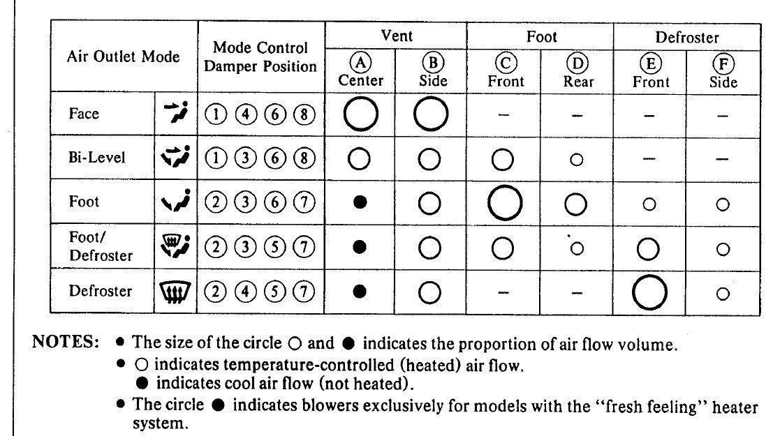 Действительно пытливый и каверзный японский мозг заложил для "морозной свежести" из центральных дефлекторов байпас холодного воздуха, который перекрывается вышеупомянутой заслонкой (1) в положении грудь и ноги/грудь. При фиксировании этой заслонки в положении перекрывающей байпас холодного воздуха существенно меняются потоки воздуха в воздуховодах, по этому снижается поток в боковых дефлекторах.