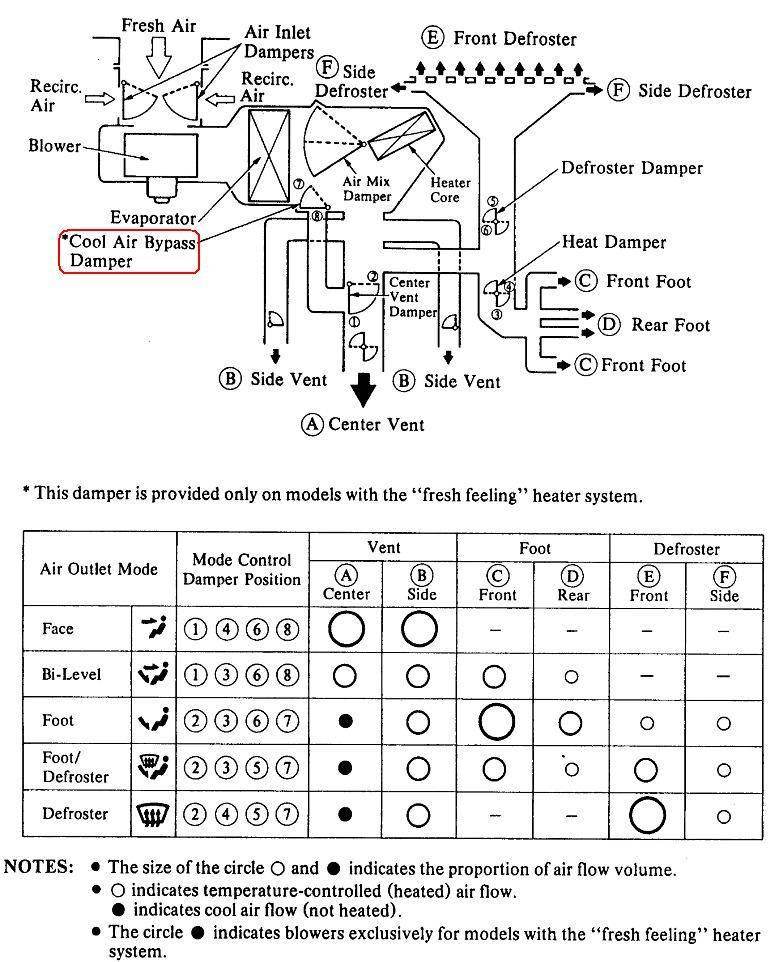 Судя по документации у этого обводного канала "морского бриза" есть отдельная заслонка (выделено красным). Проблема в том, что у нее, по видимому, нет отдельного привода, т.е. она двигается только совместно с заслонкой центральных дефлекторов, таблица внизу рисунка это косвенно подтверждает. После устранения "морского бриза" по известному рецепту заслонка центральных дефлекторов становится постоянно открытой, а она должна перекрываться в 3-х последних положениях. Отсюда и слабый поток воздуха из боковых и других сопел. Как бы зафиксировать закрытой заслонку "морского бриза", чтобы при этом не потерялась функциональность заслонки центр. дефлекторов?