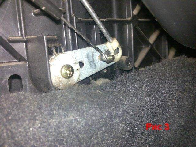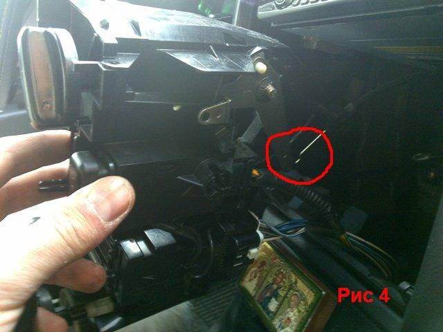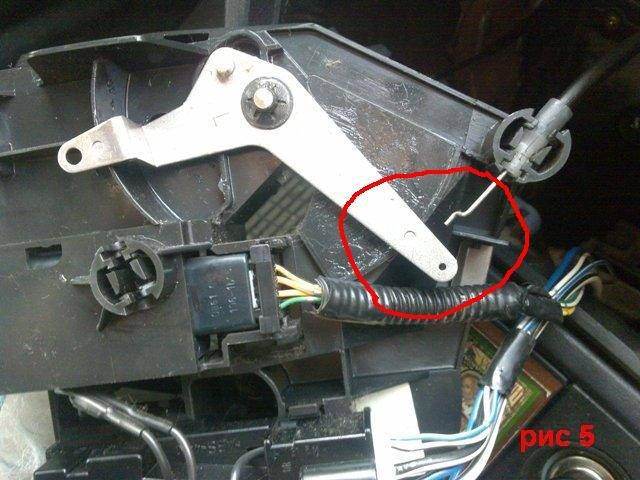 Слетел тросик, который отвечает за регулировку температуры воздуха (рис. 1). С одной стороны он крепится к сине-красной "крутилки" (рис.2) (крепление снизу, на рисунке не видно(будет видно на рис.4)), а с другой под ногами слева у пассажира (рис.3) Так вот он соскочил у меня со стороны сине-красной крутилки (рис. 4), в увеличеном виде вид снизу (рис.5). Как его соединить с металлической пластиной, чтобы работала крутилка температуры?Дело в том что на всех тросиках стоит крепления системы "петля", как и под ногами пассажира, накинул тросик, закрепил пластмассовой заглушкой и всё. А тут, ума не приложу как сделать. Не исключаю возможности что там детали какой-нибудь недостаёт.