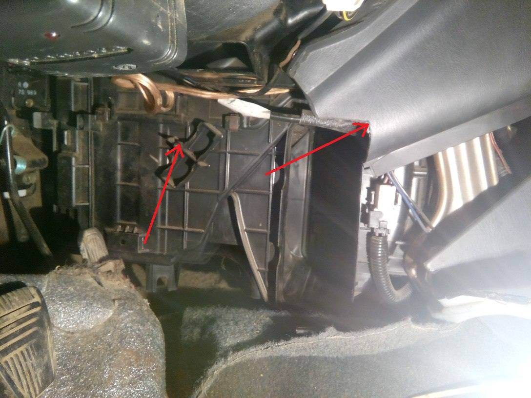 Комментарий к файлу: Сняв крышку, откручиваем скобу фиксации патрубков радиатора. Для того, что бы не разбирать пол панели, я просто вырезал небольшой уголок, что бы легче вытащить потом радиатор.