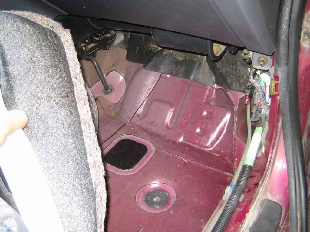 Выдавливало у меня пробки. Назад ставить несложно. Когда шумоизоляцию дополнительную делал, перед правым задним сиденьем этой пробки, после снятия ковра, не обнаружил. Подобрал из старых запасов подходящую от ТАЗа. Небольшое несоответствие по размеру компенсировал посадкой пробки на автогерметик. А после высыхания оного, дополнительно забрызгал снизу стык антикоррозионной мастикой из баллончика.