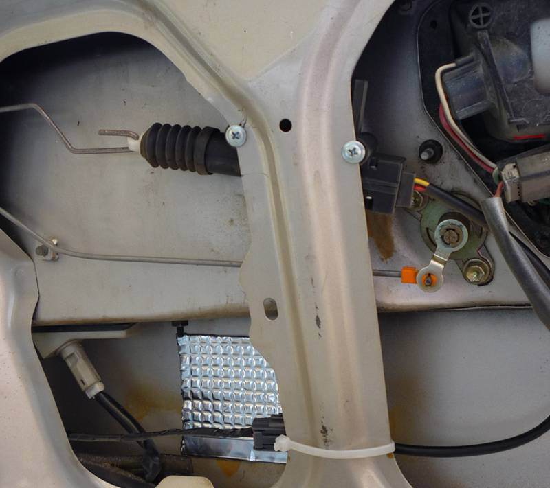 Была небольшая сложность в соединении тяги соленоида с рычажком замка багажника. На испытаниях вобще был шнурок и было все просто, но надоже сделать все на совесть. В итоге я сделал серьгу из тонкой жести с отверстием 5 мм и посадил ее на эпоксидку (в миру ее называют жикие гвозди). С этой серьгой мне без труда удалось подцепиться к соединению рычажка с тягой личинки. Далее протягиваем провода вдоль основного жгута. Вложение: