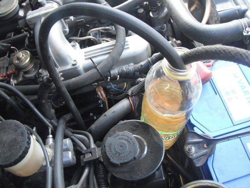 И так, откидываем шланги подачи и обратки с тнвд, надеваем наши заготовленные шланги, наливаем в бутылку промывку, шланг подачи опускаем полность, обратку вывешиваем над уровнем.