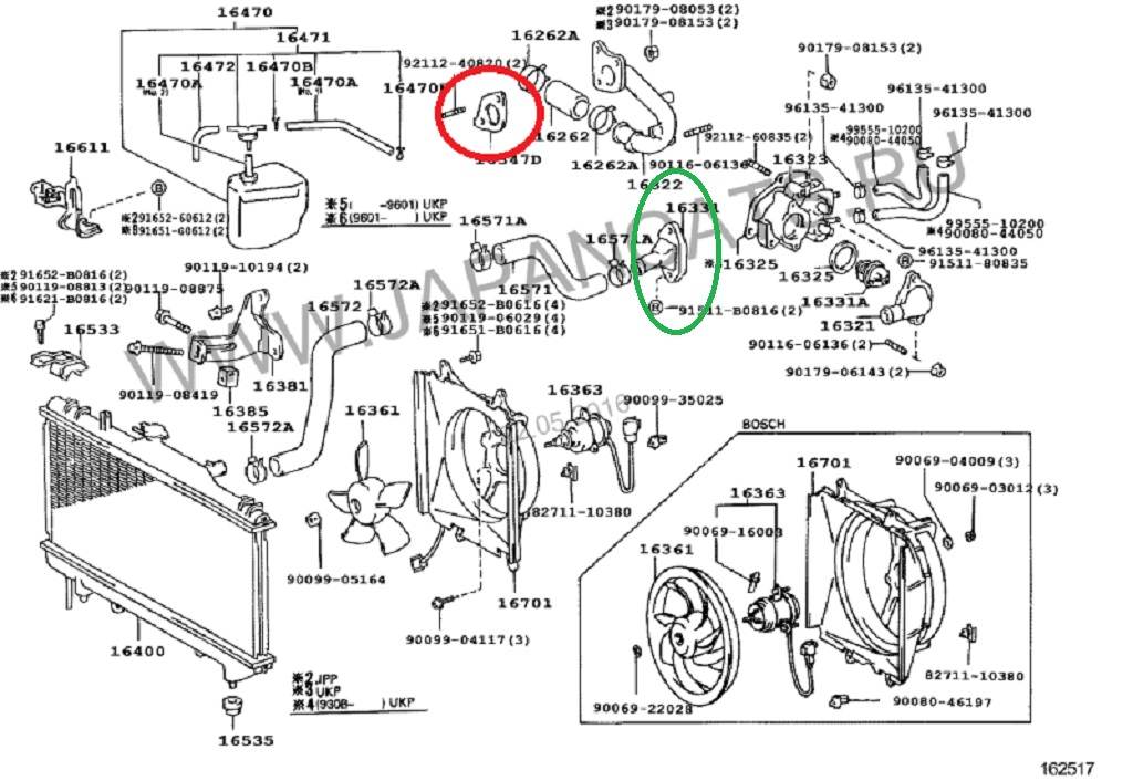 Всем привет! на днях начал подтекать патрубок (за которым стоит термостат)в месте крепления к двигателю. Решил отремонтировать:слил тосол, разобрал все прочистил\зачистил, намазал герметиком соприкасающееся плоскости , выдержал время, собрал- короче все делал как для себя.... прогрел движок, давление в системе поднялось - и Опять потекло еще больше и в том же месте!!! Так вот вопрос: судя по приведенной "родной" схеме, герметичность соединения обеспечивается за счет П-образного резинового кольца надетого на термостат(там больше нет никаких прокладок), че делать? если даже герметик не держит, может еще какую прокладку добавить? резинку новую хрен найдешь, заказывать надо ,патрубок можно только шлифануть...  Кто-нибудь сталкивался с подобной проблемой?