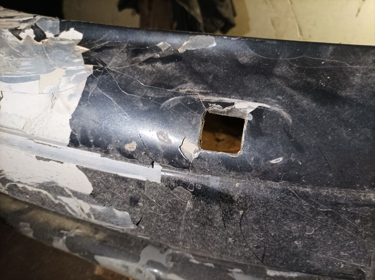 2. Передний бампер (вроде оригинальный) под рихтовку/покраску, с отверстиями под омыватели фар и с заглушками в туманках. Пара креплений сломаны но, в целом, всё в порядке.