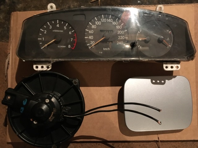 Ремни безопасности к-т 4 шт-600 Фонарь задний левый с металлической накладкой под фонарь (накладка в отличном состоянии) и проводкой,но на фонаре есть трещина-500 Моторчик печки -800 Приборка Т18 работоспособность неизвестна ( на запчасти )-400 руб.