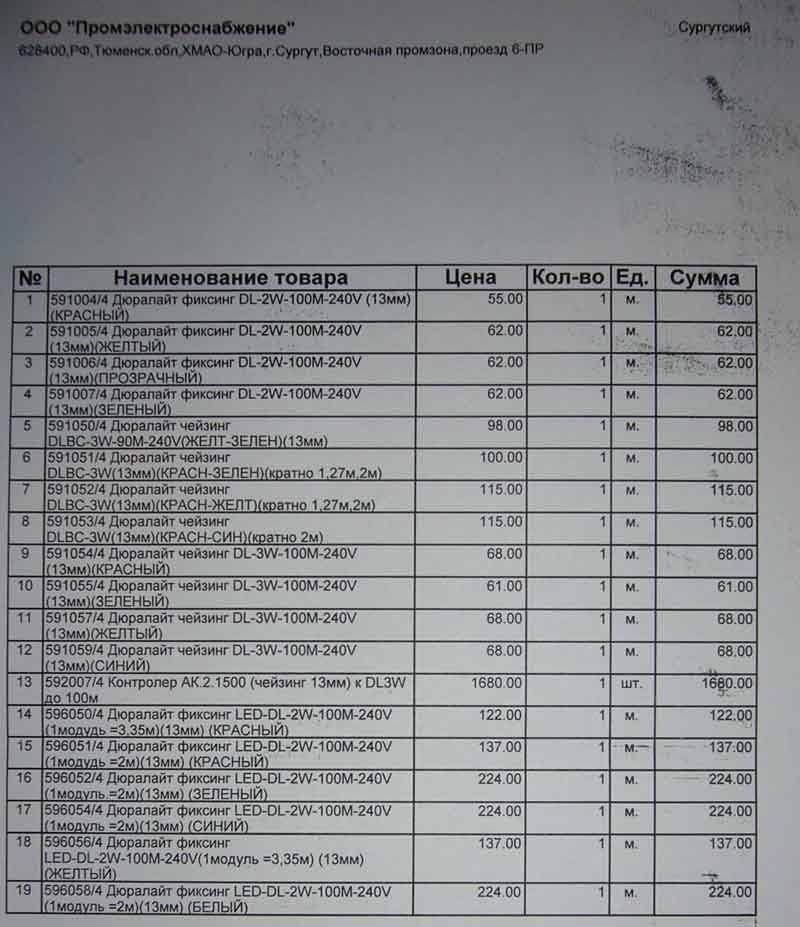 Lex@84,ты,наверное,весь народ распугал такими космическими ценами на лед-дюралайт  прикладываю прайс для ознакомления  в двух магазинах был,везде дюралайт только на 220В.на 12В в продаже нет.думаю на него нет спроса,поэтому и нет.знакомый еще один магазин подсказал,на днях заскочу посмотреть что там.