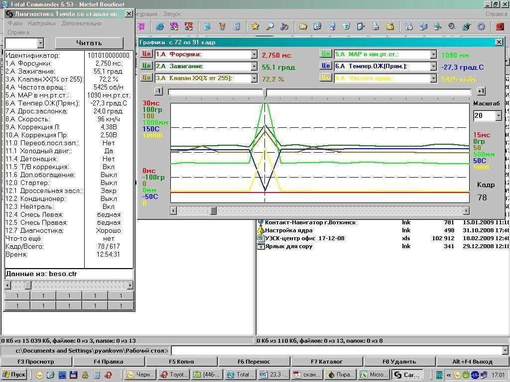 БелыйГусь писал(а): разбор полетов Спасибо.  БелыйГусь писал(а): ХХ, которые кажутся слегка завышенными - 825-850 Как уже говорил, такое ощущение, что прогревается мотор долго. СтОит выключить машину минут на 15-20, потом завести, а обороты снова около 1500, как на холодном движке, хотя температурная стрелка стремится занять свое законное место. Даже, когда она его занимает, то повышенные ОХХ держатся еще довольно долго. Вот, даже не хватило того времени упасть до нормальных 750 об., пока проводилась диагностика. БелыйГусь писал(а): досаждает вибрация Забил я на нее. Все, что мог,- сделал - не помогло... и забил. А раскоксовочка? Ну ее, не хочу. Вот покрашу машину и может-быть к концу лета, ЕБЖ, полезу в мотор. БелыйГусь писал(а): можно попробовать поподробнее посмотреть