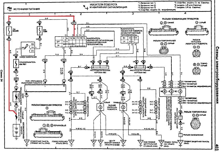 =aleks= писал(а): Получается грешить осталось на реле аварийки?? Я так понимаю оно отдельное? Реле одно!!!, если повороты работают, значит реле исправно!, нужно проверять цепь аварийки, =aleks= писал(а): Повороты работают,но только стоит нажать кнопку аварийки не работает не повороты,не аварийка это происходит потому что кнопкой, реле переключается на плюс, минуя замок зажигания, через тот самый предохранитель, и лампы поворотов переключаются напрямую к реле, минуя подрулевой, проще говоря, реле с лампами отключаются от схемы поворотов, и подключаются к схеме аварийки, но поскольку питание не приходит, оно и не работает, смотри еще раз предохранитель, если даже выглядит целым, попробуй поменять, если не поможет, значит где то дальше, или фишка в блоке предохранителей (снизу), или где то провод перетерло/перебило Вот схема, качество не очень, какое есть, выделил цепь плюса на аварийку: Вложение: