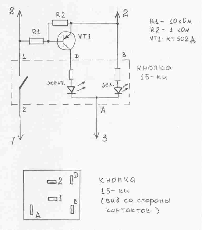 В электрической схеме цифры и буквы возле кнопки - нумерация выводов кнопки 15-ки. Цифры у стрелок - нумерация контактов штатного разъема кнопки ПТФ в машине. Извините за качество, рисовал от руки.