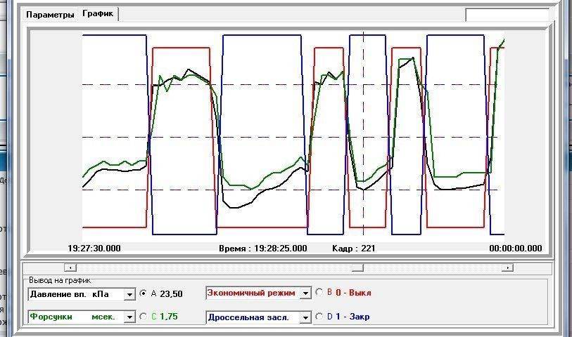 Mister ToCaE писал(а): Одеваю фишку на ДПДЗ, снимаю с ЭБУ - на контактах 11 и 9 только 1,85 Ком Когда измеряете напряжение , не забудьте измерить и напряжение на контакте VC. mediaboy писал(а): а я педаль еле еле давил. Угу, вот участок в районе 210 кадра  “Экономичный режим” на графике, это “Дополнительное обогащение”. А так вы зря обижаетесь, обратная связь почти все время есть, ЛЗ работает.