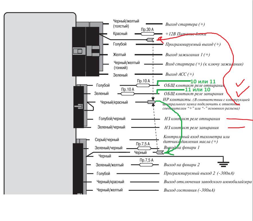 ALEX-72 писал(а): tab16 писал(а): плюс с сигналки идет на реле, которое подает минус на контакт ы 10 или 11. Тогда вообще не понимаю зачем это нагородили tab16 писал(а): по мне это лишние сложности. ( я прав?) Прав конечно, зачем лишние реле в цепи, там и в сигналке реле есть, подключай как я на схеме рисовал зелёным: Вложение: 3453452.PNG провода от сигналки с предохранителями на контакты 10 и 11, какой куда разберешься, вот что делать с штатным реле ЦЗ не подскажу, если есть знакомый радиолюбитель, можно отдать ему проверить, то что возможно, ну и еще нужно убедиться что все провода в двери и салоне, которые идут на контакты 10-11 целые, и массы тоже, кстати проверь при нажатии клавиши откр/закр на блоке стеклоподъемников, на контакты 10-11 масса приходит? думаю лучше с отключенной фишкой от реле это делать  при нажатии на кнопки масса приходит. Проводка на всех участках прозванивается без сопротивлений. Заказал новый блок, жду) спасибо