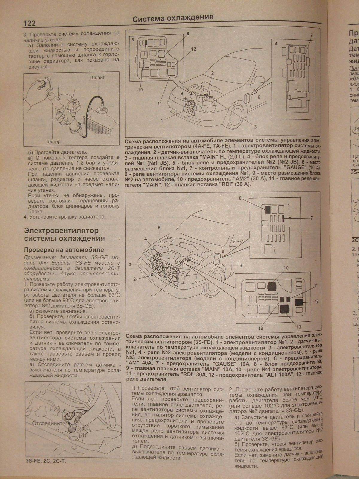 diablo писал(а): ну да. на всех наших. Нету книжки под рукой, но на 3S-FE датчик-размыкатель может находиться в нижней части радиатора. Помнится мне Вот вам рецепт проверки при постоянно крутящемся вентиляторе от OldB с Корона-клуба - http://corona-club.ru/index.php?option= ... 5#msg65545 Цитата: 1.