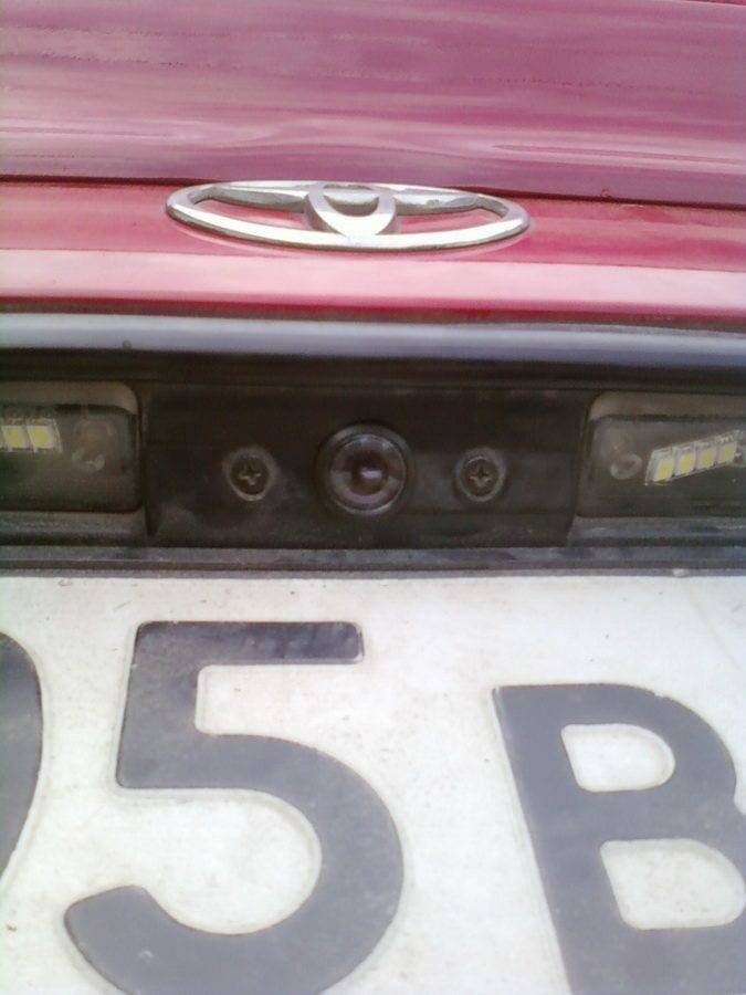 5) Теперь выпиливаем по размеру отверстие под камеру в пластиковом кожухе фонарей освещения номерного знака и вставляем камеру... что бы исключить попадание воды внутрь - обработайте все хорошенько герметиком.И получаем примерно вот такую картину: