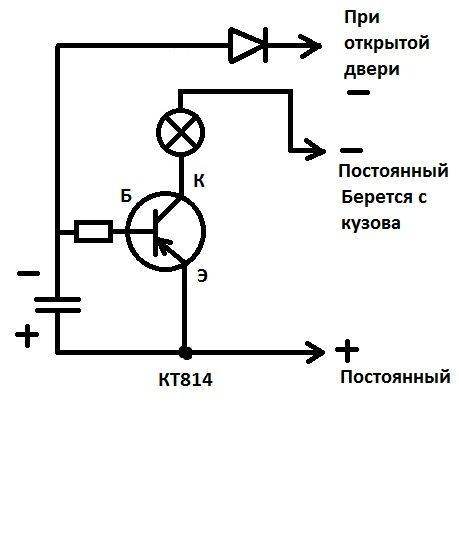 Когда себе делал, не нашел на форуме никакой информации. Вот самая простая схема, которую сам придумал. В интернете изобилие всяких разных схем, но на мой взгляд они какие-то непонятные (в смысле много лишних деталей). Принцип работы: При подаче напряжения "+" на Эмиттер, "-" на Коллектор, и если на базу транзистора действует отрицательное напряжение относительно эмиттера, то лампочка будет гореть. Конденсатор заряжается и после закрытия двери автомобиля прекращается подача минуса на базу. По идее лампочка должна погаснуть сразу, но по мере разряда конденсатора лампочка тоже будет гаснуть плавно. Вот и все! Чем больше емкость кондера, тем дольше лампочка будет гореть. Короче, транзистор будет открыт дольше. Типа реле. Я вместо лампочки купил диодную ленту, разрезал её по три диода на участок. и приклел их вплотную друг к другу к заранее подготовленной пластмаске (вырезал из коробки от DVD дисков). В моем случае я использовал конденсатор емкостью 470мкф потому, что у диодов потребление тока меньше и с кондером в 1000мкф уж больно плавно гаснут диоды (несколько минут). С лампой накаливания лучше использовать 1000мкф (ИМХО). Эксперементируйте друзья! Резистор 200...300 Ом.