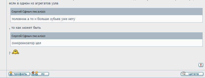 Бывалый писал(а): Если передачу не выбивает то синхронизатор цел. Синхронизатор предназначен для уравнивания крутящегося момента между шестерней и вторичным валом, в результате чего и достигается бесшумное и безударное включение,а не фиксация передачи. А выбивать может из-за стачивания или износа самой шестерни под конус или коробка откручена от картера сцепления. Может быть фиксатор плохим или с вилкой что-нибудь случилось, но никак не синхронизатор виноват. Бывалый писал(а): В синхронизаторе стоит бронзовое кольцо безударного включения Это бронзовое кольцо называется КОЛЬЦО СИНХРОНИЗАТОРА и оно является одним из узлов самого синхронизатора, а если в одном из агрегатов узла Бывалый писал(а): половина а то и больше зубьев уже нету , то как может быть Бывалый писал(а): синхронизатор цел ?
