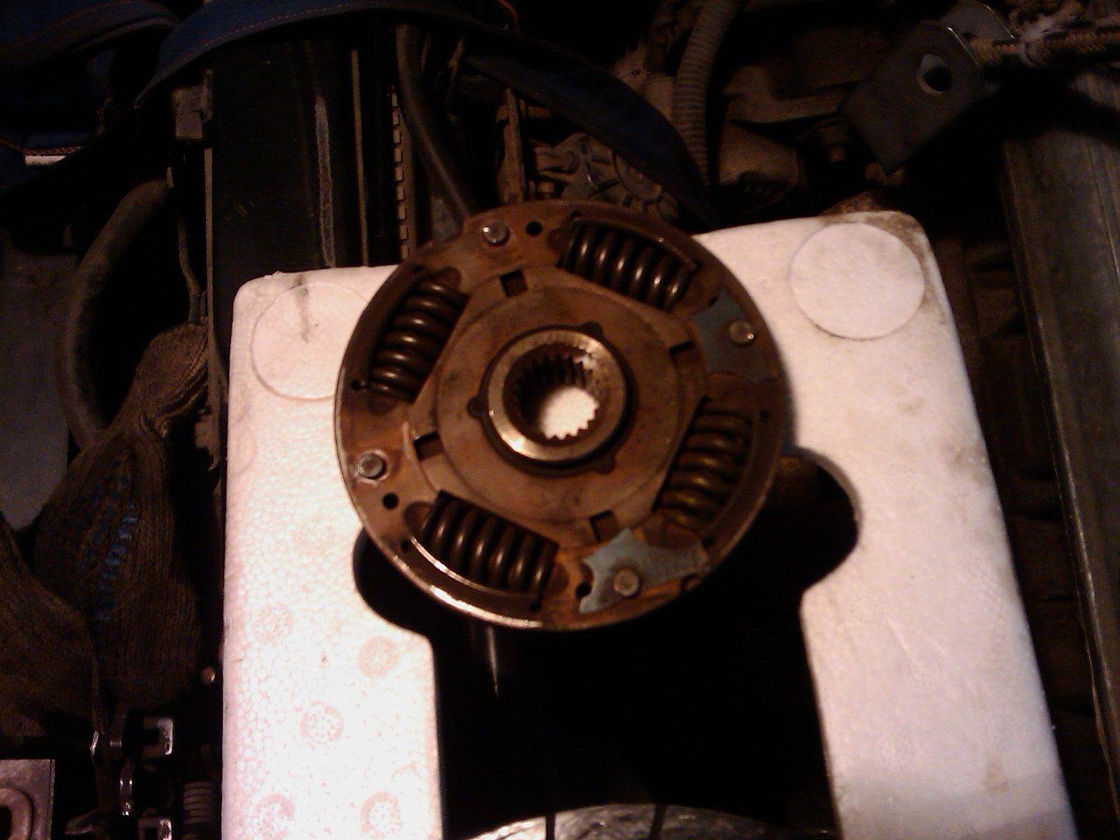 Всем доброго времени суток. итак, как обещал отписываюсь. МКПП С52. Поломка оказалась в диске сцепления, а точнее поломан оказался диск сцепления (см.фото) Машина не наша, у знакомого. Замену проводили самостоятельно в гараже с ямой. Фотоотчеты по замене сцепления присутствуют, но и от себя скажу не та это процедура не самая простая, но вполне осуществима. Коробку снимали/ставили на не снятый мотор в первые. Глаза боятся руки делают Итак. 1. Снимаем коробку - снимаем АКБ, корпус воздушного фильтра - отцепляем ДЗП (датчик задней передачи) и ДС (датчик скорости), так же откручиваем массу и рабочий цилиндр сцепления с магистралью - отцепляем тросики от кулисы - откручиваем ступисчные гайки гайки залазим под машину - снимаем локера с левой стороны - ослабляем нижнюю шаровую (тут мы открутили только левую шаровую, причем скрутили болт и две гайки от рычага, а не от самой ступицы)) - поддомкрачиваем левую сторону и ставим ее на "пенек" - снимаем левый привод, без внутренней гранаты. (Мы просто не стали рисковать и не стали выбивать, но думаю слив масло и вынув привод вместе с внутренней гранатой будет удобнее. - с правого привода снимаем хомут внутренней гранаты и сдергиваем пыльник, в данном случае была проволочка которая в последствии была заменена на полноценный хомут. - откручиваем болт передней подушки, и снимаем продольную балку вместе с подушкой - снимаем стартер. (если старте снимать до снятия продольной балки то это менее удобно. Понял это уже при установке стартера. - сняли капот и подвязали двигатель к "кран балке" чтоб не упал двигатель - снимаем левую опору двигателя вместе с кронштейном! - снимаем заднюю подушку - нам показалось что будет проще если снять и кронштейн к задней подушке который крепится к коробке. Было два варианта либо вынимать подушку, либо снимать кронштейн. Визуально оценив ситуацию, было решено снимать кронштейн потому как подуху не вынуть пока его не снять - откручиваем болты крепления коробки к блоку. - проверяем что от коробки все откручено и ни чего не соединяет ее с двигателем - сдергиваем коробку в левую сторону. Обращаем внимание что правая внутренняя граната имеет свойство зацепляться за защитный металлический щит который между коробкой и блоком находится. Поворачивая привод немного можно упростить сдергивание коробки. Но у нас это кровушки попило. Несколько раз в голове промелькнула мысль о том что проще было слить масло и сдернуть вместе с гранатами привода. Коробка снята под машину. перекур сунув палец в корзину и побренчав диском сцепления было удовлетворение от проделанной работы ибо не зря! Заняло сие мероприятие около 4 часов. Установили диск сцепления (5а-fe) и корзина (4а-ge) контрактные. Стоявшая корзина уже перегрета оказалась в следствии чего деформирована Для центровки диска был куплен вазовский выравниватель диска. Не скажу что идеально но подошло. От ГАЗа уже не подошел, диаметр больше. Воспользовавшись случаем были заменены картриджи в задней и передней опоре двигателя. Установка МКПП - ставим подушку заднюю на место, но не фиксируем, вдруг что. - самое важное в этом это отцентрированность диска, если отцентрировано идеально, то мучения будут не зря. - Сразу скажу что нам пришлось снять правый привод, потому как проще его снять и потом установить чем пытаться попасть им в гранату. Так же сняли кронш