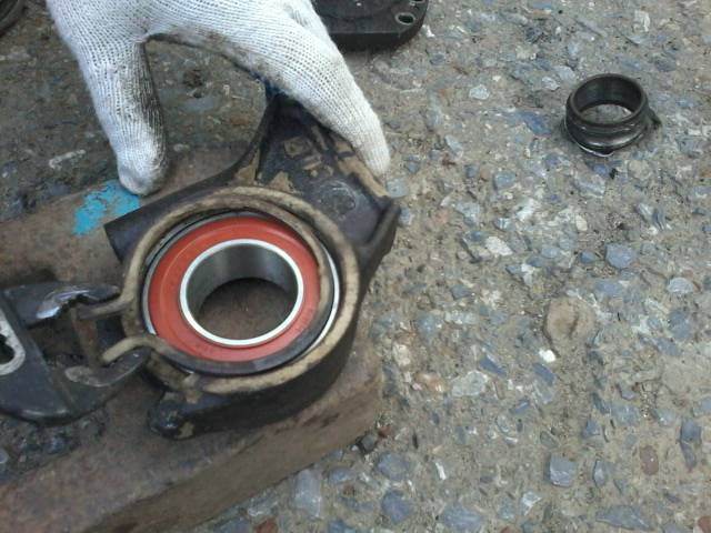 13. Новый подшипник сначала запрессовываем в корпус, застёгиваем большое стопорное кольцо и набиваем эту конструкцию на палку, используя подходящую по диаметру проставку. Проставка в виде трубки ставится на внутреннюю обойму чтобы не бить через шарики.