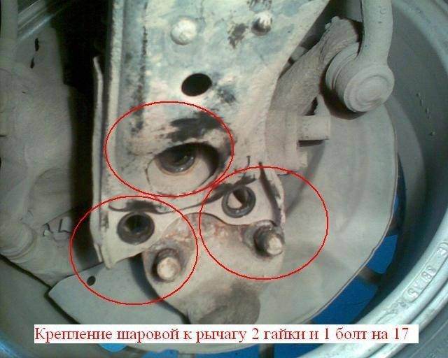 2.Открутить 2 гайки и 1 болт на 14 крепящие шаровую к рычагу (я сдвинул гайки чуть с места еще не поднимая на домкрат).