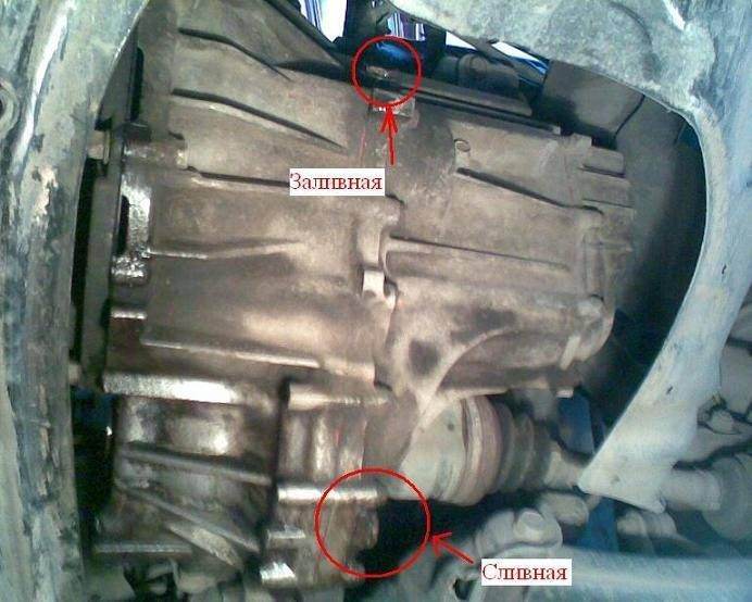 1.Подставить тару для сбора стекающего масла под сливную пробку КПП, открутить верхнюю заливную пробку на КПП и нижнюю сливную, слить масло.