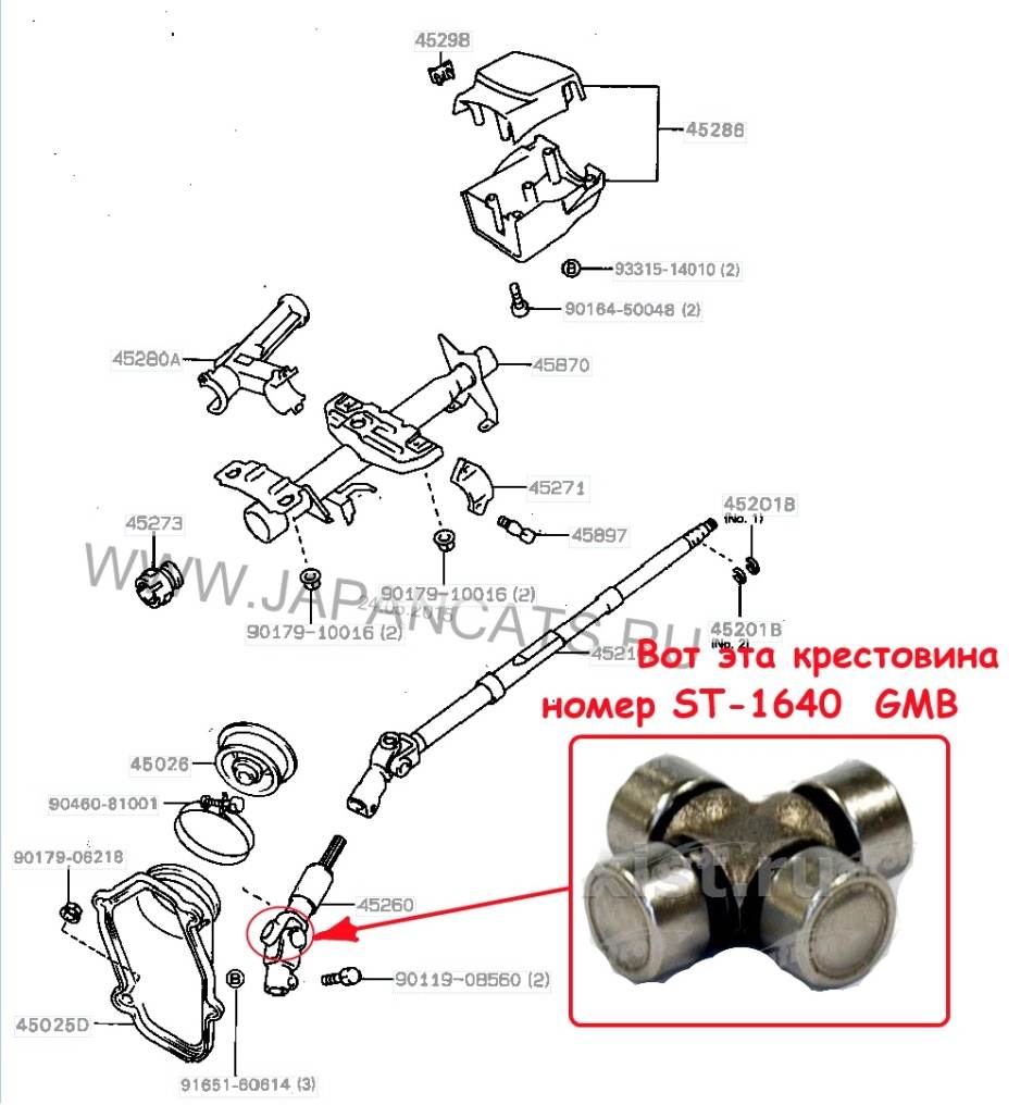 Михалыч , карданчик нижний в сборе 6000 рублей стоит оригинальный , крестовина же которую в нем нужно заменить стоит 270 рублей , меняется в течении часа-двух . Проблема 99% в крестовине . Вон набросал тебе схему рейки и где именно находится эта самая крестовина . Самому если впадлу лазить там в ковыряться , то у нас есть прекрасный специалист как раз в Нижнем Новгороде , зовут Сергей , ник MerTV телефон 89040443991 позвони договорись встреиться , он на 100% тебе даст вердикт что там у тебя сломалось , и заменит если будет свободен . P.S. не надо на Валерку(Well) ругаться , он выполняет всего лишь навсего свое дело , чистит форум от флуда и прочей хрени , все что тут разжевано есть в специальной теме что я тебе кидал выше посвященной карданчику , не знаю как ты не смог найти эту тему . Добавлено спустя 11 минут 5 секунд:а , уже объединили эти темы в одну , оперативно
