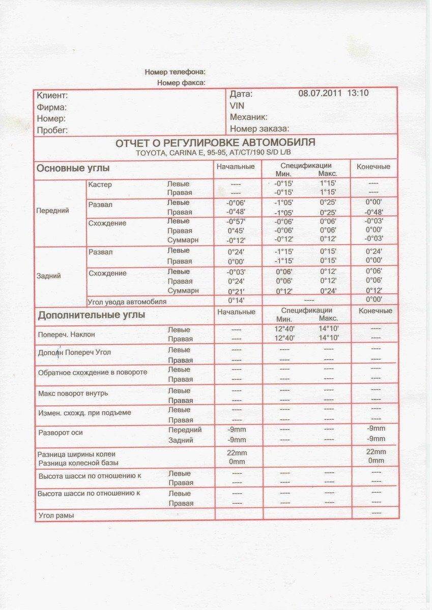 Мастер этот - понторез. Он, случаем, не сказал, что все эти хитронавороченные современные стенды калибровать раз в месяц надо? Калибровка стоит порядка 1000 у.е., вот и экономят сервисы. Как правило, получается, что прибор показывает все пучком, а в реале значения совсем другие. Кастер, как указал Beso, вообще неизвестен. И, судя по показаниям, правое переднее колесо должно раком стоять, завалившись внутрь, а заднее левое завалено наружу. Т.е. развал вообще не регулировали. Я бы заставил переделать  если будет утверждать, что развал не регулируется, то объясни мастеру про регулировочные болты, а то я сталкивался с таким: "Это же Тойота! На ней регулировок развала нет!". Даже кастер можно двинуть незначительно, если руки у мастера из правильного места.