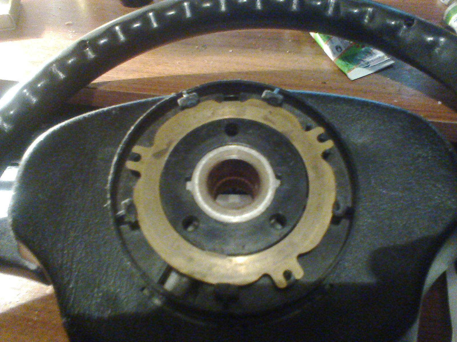 У тебя (92 год) механическая подушка. Снимаешь заглушки , отворачиваешь винты( звездочки) вынимаешь пластиковую скобу справа, снимаешь подушку, откручиваешь гайку и с помощью .............матери сдергиваешь руль с вала.если не уронишь подушку, то ничего не рванет, не бойся Скорее всего стерся шлейф, раз сигнал работает в одном положении.