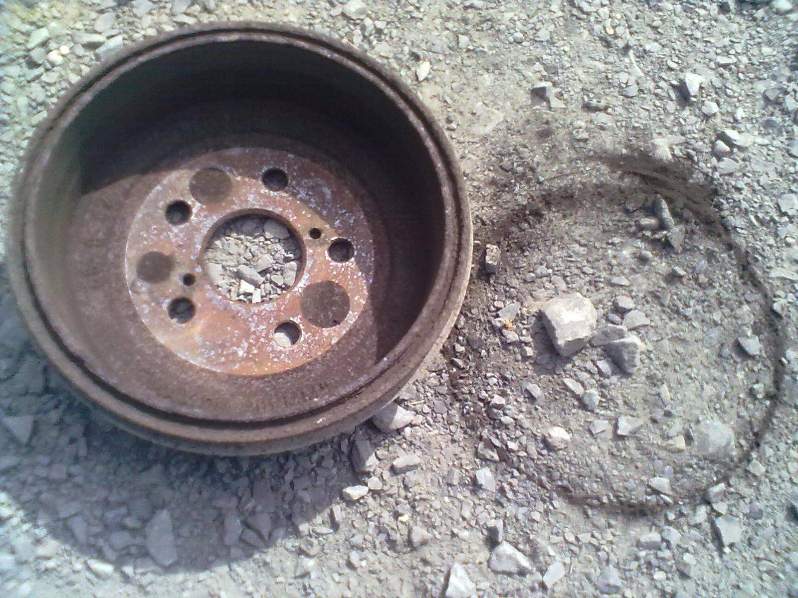 Комментарий к файлу: Состояние тормозного барабана. Коррозия есть, но в целом еще нормально выглядит. А справа от него - это все, что высыпалось когда снял и положил его на землю