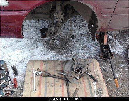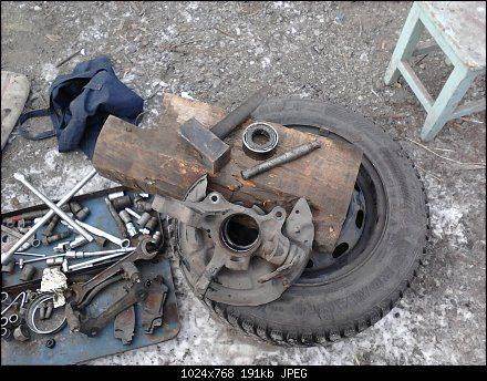 В первую очередь перепрессовал задние подшипники,примерно так, http://forums.drom.ru/toyota-caldina-ca ... 27606.htmlобошелся без болгарки,гайка прекрасно откручивается без подпиливания,а кольцо внутренней обоймы снял съемником. Пока делал зад было не до фотографий. И так вытаскиваем кулак,отцепляя от него все ненужное для удобства. Вложение: