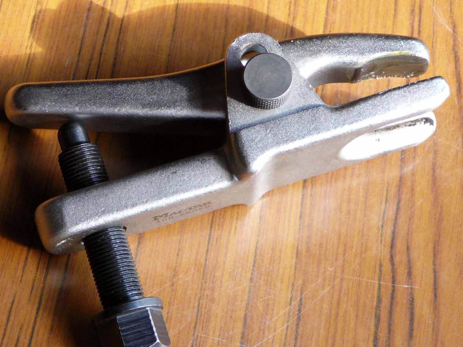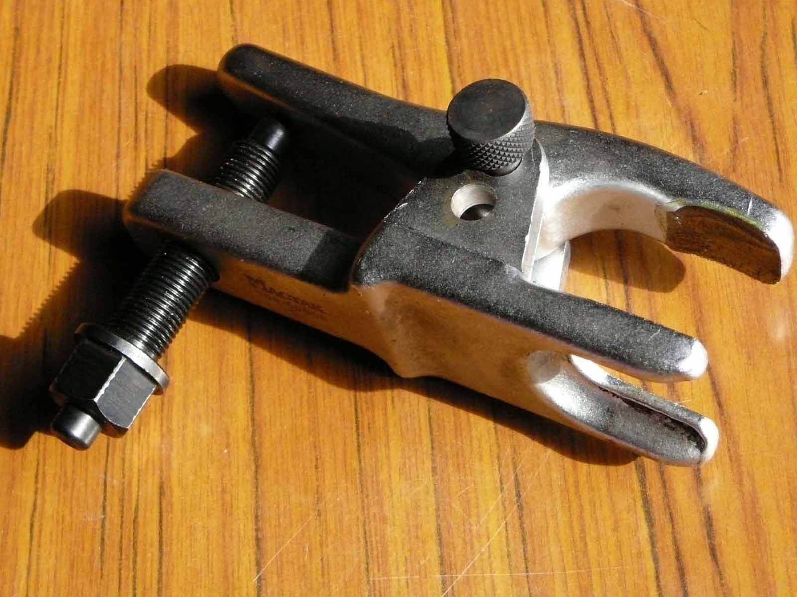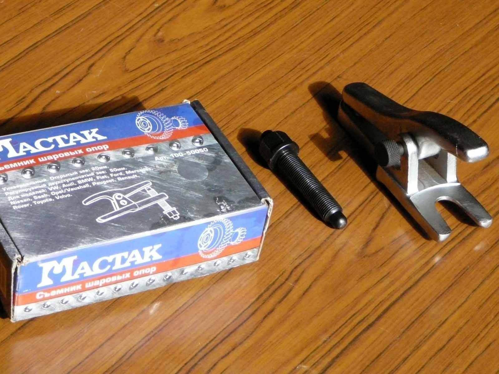 Все правильно глаголит Vitek, есть у меня такой съёмник, очень удобная штука  Покупал рублей за 800-900(да, не дешево) в прошлом году, но оно того стоит. Немного подточил, чтобы в шрус не упирался и всё. Работать им одно удовольствие. Не надо избивать машину молотком и ковырять монтажкой. Поставил, покрутил болт и шаровая (или наконечник - он универсальный) снята! Если интересно, могу отфотать и выложить завтра.