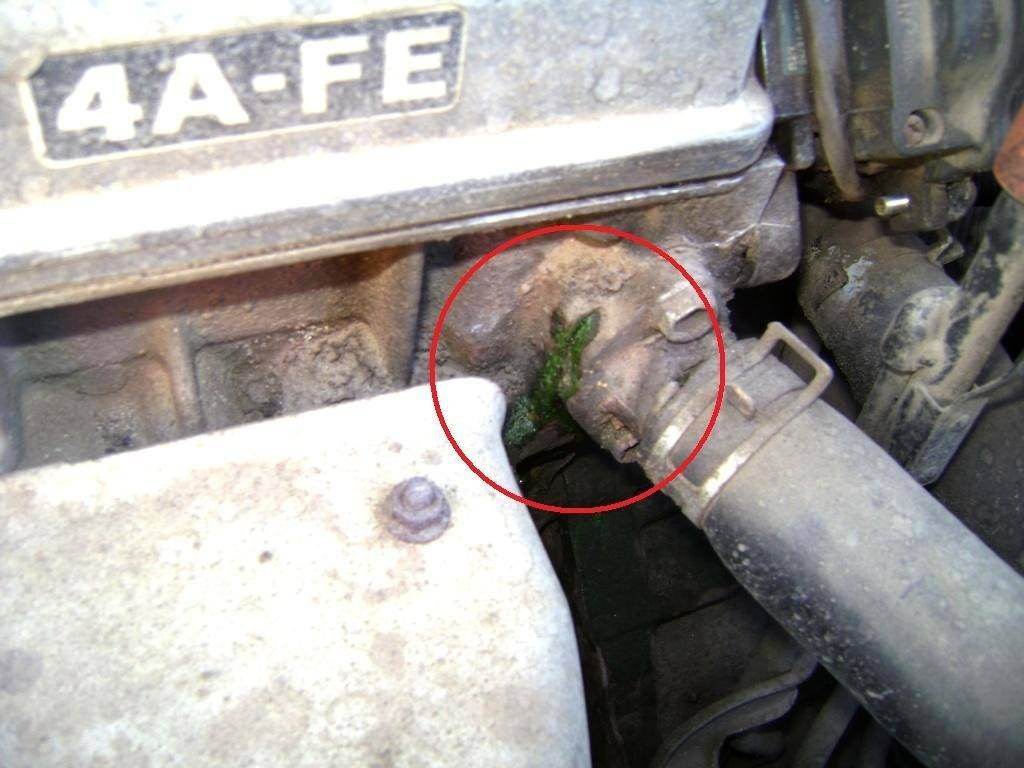 Потекло соединение патрубка радиатора с блоком двигателя. На фото - крупным планом. Зелёное - это антифриз.