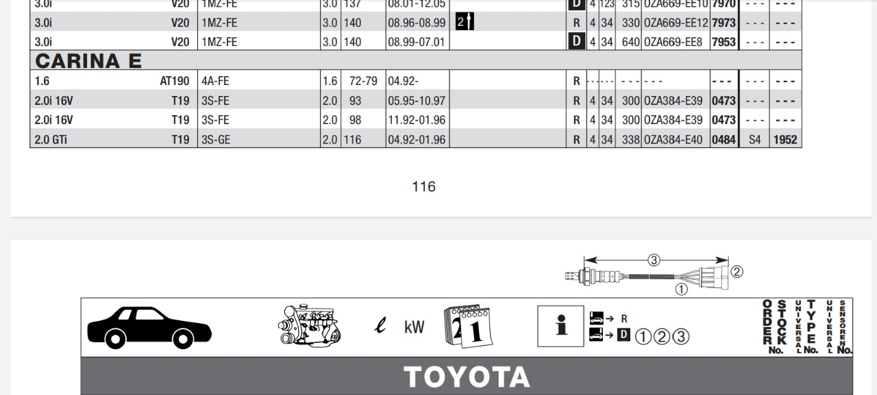 Ни одна из тойотовских лямбд, сделанных на основе DOX-0106 не ставилась на Карины Е. На обычный не бедный 4A-FE ставился бошевский датчик с тойотовским номером 89465-05020, и этот датчик соответствовал универсальному DOX-0114, и он вроде как 6.5 Ом, хотя у самого бошевского датчика сопротивление было 3.5 Ома на холодную. Самый молодой оригинальный датчик, снятый с Карины Е, будет иметь возраст порядка 26 лет, не уверен, имеет ли смысл искать и ставить такой старый датчик. Наверное, лучше или купить универсальный DOX-0106, или найти молодой датчик с сопротивлением 7-8 Ом с любой машины, не обязательно с тойоты.
