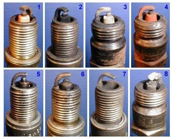 Свеча на фото № 6 вывернута из неработающего цилиндра. Центральный электрод, его юбка покрыты плотным слоем масла смешенного с каплями несгоревшего топлива и мелкими частицами от разрушений, произошедшими в этом цилиндре. Причина этого - разрушение одного из клапанов или поломка перегородок между поршневыми кольцами с попаданием металлических частиц между клапаном и его седлом. В данном случае двигатель "троит" уже не переставая, заметна значительная потеря мощности, расход топлива возрастает в полтора, два раза. Выход один - ремонт.