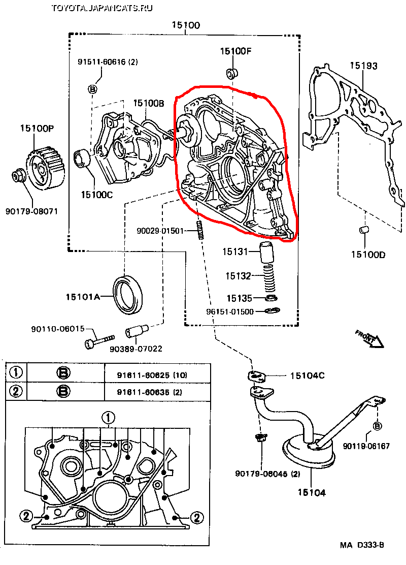 Разобрал, проблема в том что на обводном ролике обломало болт, теперь выкрутить обломышь не могу, т.к. там сорвана резьба в крышке блока ещё в добавок, короче обломышь крутиться а не выкручивается, плюс надо как-то резьбу восстанавливать, чтоб обводной ролик поставить. А для этого надо теперь переднюю крышку блока откручивать, уже снял маслянный насос, но эту саму крышку, где обломышь снять не могу, что-то держит, а что, понять не могу. Подскажите, что это может быть, крышку которую надо снять, я на рисунке обвел красным.