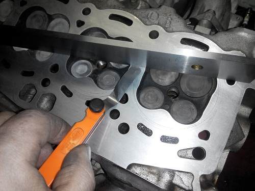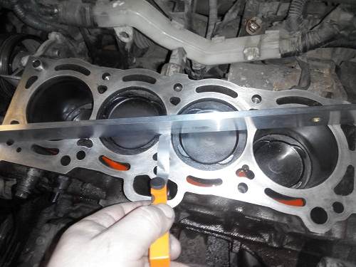 Mateo писал(а): Привет Каринаводам. Den301 себе ставил год назад фирмы Чекстар -11082 (цена 420 руб.) Привет, Mateo! Попробовал прогуглить такую прокладку ГБЦ у нас, но ничего подобного не нашёл ВАще( может плохо искал  ). Кольца, вкладыши ( шатунные ) я менял в первый раз поднятия бошки, а с тех пор отец проехал хорошо если тысяч 30. Последний раз, когда шлифовал голову и блок, то проверил зазоры в кольцах, там всё супер. Добавлено спустя 43 минуты 8 секунд:Приветствую всех фанатов TOYOTA, и CARINA E в частности  !!! Пришло время рассказать вам о том, как я добрался до ремонта автомобиля отца. Если время позволит, то выложу кое-какие результаты измерений, чем, может быть, помогу нашему сообществу в будущем, а заодно и отвечу на многие вопросы, которые мне задавали в процессе сбора мной хоть какой, полезной мне, информации. Вобщем приступим: Загнал я машинку к себе в бокс и начал её осматривать. Добавлено спустя 27 минут 21 секунду:Начал снимать навесное, сливать антифриз и подготавливать всё к разбору мотора. Кстати ,недавно, насмотревшись умных людей, сделал себе такую при блуду, как пневмотестер. Очень уж понравилось мне, какие проверки можно проводить с его помощью. Так вот диагностика пневмотестером показала, что второй, третий и четвёртый цилиндр немного "дуют" в выпускной коллектор. Значит ещё нужно будет немного терануть выпускные клапана.... Снял распредвалы и решил проверить моменты затяжки болтов ГБЦ: Зажиматься они начинали со щелчка. Проставил всё в очерёдности того, как они стоят на моторе: Впускные болты: 1 2 3 4 5 щелчок(срыв) 83 83 83 83 91 момент 79 79 79 81 90 Выпускные болты: щелчок(срыв) 83 83 -- 83 98 на третьем болте щелчка не было, плавно пошёл зажиматься момент 78 78 81 78 93 Вытянул болты: Добавлено спустя 8 минут 11 секунд:Кстати был предположен вариант того, что, возможно,после нескольких шлифовок, болт упёрся в блок и недожался. Промерял глубину резьбы в блоке и глубину отверстия в головке. Получилось: впускная сторона блока 33,6 мм, выпускная сторона блока 51,6. Глубина в головке 60,6 мм. Получается впускная сторона 94,2 мм (при длинне болта 90 мм), а выпускная сторона 112,2 (при длинне болта в 108 мм). А на них ещё шайбы одеты толщиной миллиметра в 2,5. Толщина снятых болтов была промерена и составила 8,6 мм по всей их длинне и нигде не плавала. Добавлено спустя 21 минуту 37 секунд:Снял ГБЦ, почистил её, почистил блок и промерял их на неплоскостность лекальной линейкой. В блоке нигде не получилось подсунуть щуп в 2 сотки. На головке в одном месте этот щуп пытался подлезть под линейку, но закусывался и не пролез. Добавлено спустя 8 минут 27 секунд:Получается, что с неплоскостностью проблем нет.